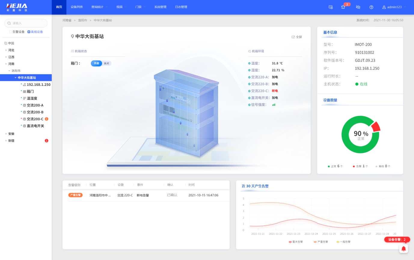 平臺界面顯示3路交流輸入狀態(tài)、1路直流輸出狀態(tài)、箱門狀態(tài)、無線模塊信號等實時數(shù)據(jù),同時展示當前交流斷電、直流斷電、箱門打開等未解除告警信息。