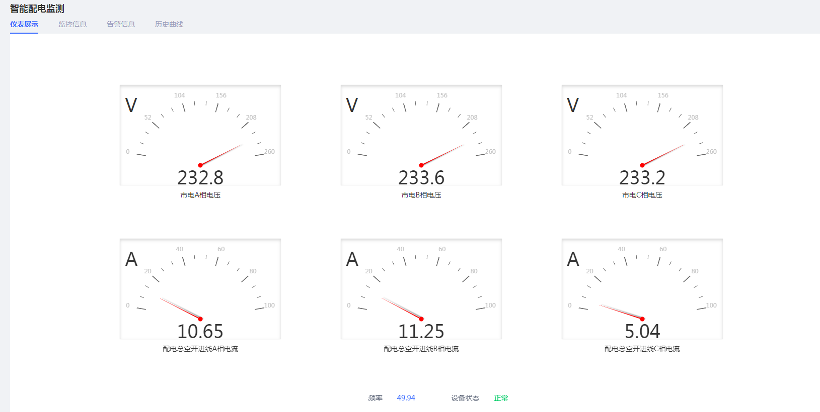 對兩路市電的三相電壓、電流、功率電能等主要參數進行實時監測,市電斷電報警。