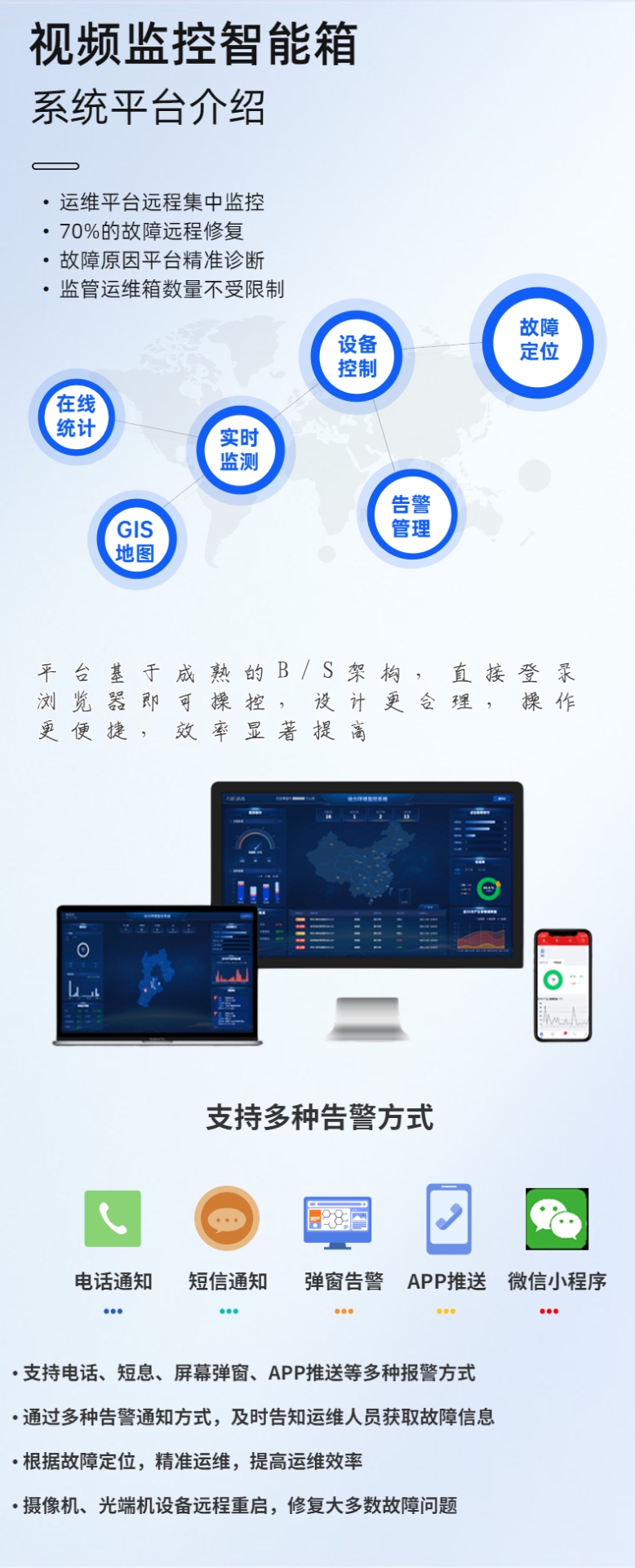 建立集中告警分析及顯示平臺,當故障發生時及時定位故障問題,發現故障原因,通過短信、手機APP、聲光、瀏覽器、微信等一種或多種報警方式通知運維人員,從而調動可用資源,從而縮短故障解決時間,降低運維成本