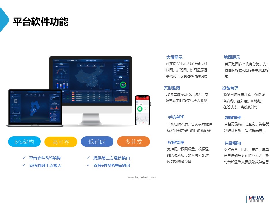 倉庫動環監控系統平臺通過物聯網技術集成門禁系統、監控系統、溫濕度傳感器、煙霧探測器、聲光報警器、精密空調等系統設備,實現設備運行的正常狀態監測、異常狀態預測、在線智能故障診斷等功能。該系統可向管理人員展示真實的倉庫環境信息,包括溫濕度監測、消防煙霧監測、門磁、精密空調等。通過遠程運行維護和異常報警功能,實現了“預警、預警、數據收集”的安全管理模式,提高了倉庫管理的效率和安全性。