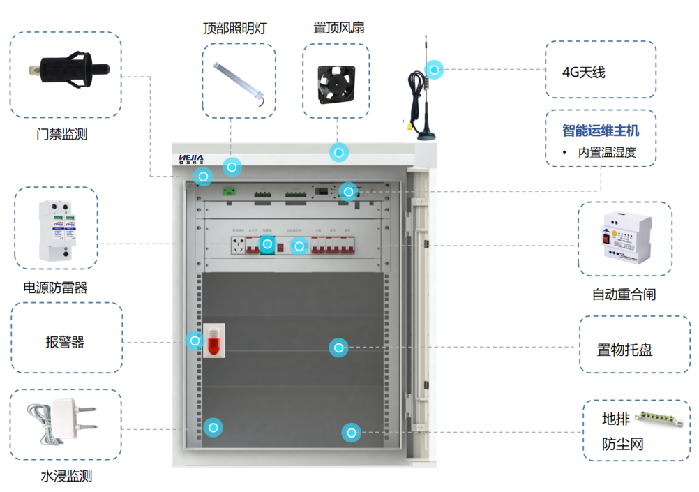 智能監控運維箱包括智能運維箱和智能運維管理平臺,可實現市電監控、設備用電監控、遠程控制、網絡傳輸監控、柜內溫濕度監控等功能。通過網絡實時與監控中心運維管理平臺通信,實現前端設備的集中監控和管理,降低運維成本,提