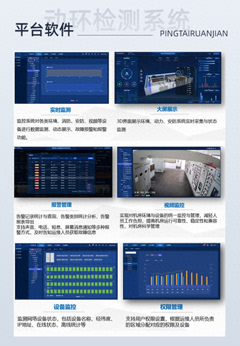 管理可視化:動環監控系統的系統平臺軟件可以將收集的數據進行可視化展示,管理人員可以通過軟件實時查看機房的運行狀態,包括設備的運行狀態、環境參數等。此外,軟件還具有故障定位和故障預警功能,能夠及時發現并處理故障,提高了管理效率。