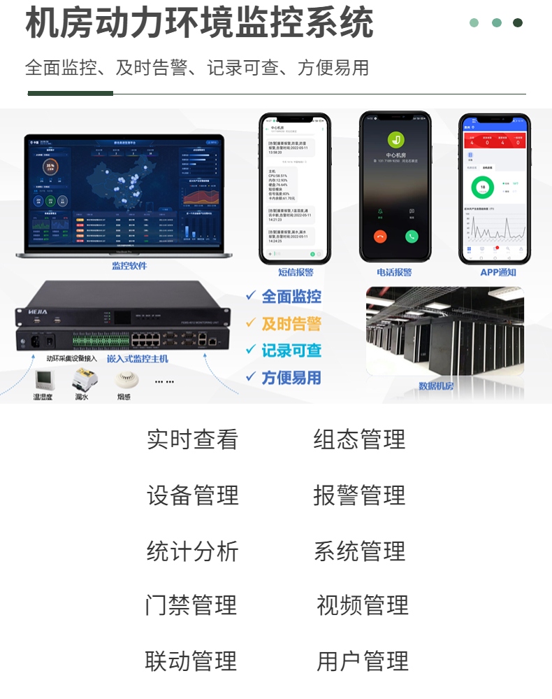 智慧交通機房動力環境監控系統采用工業級ARM低功耗芯片,性能強勁,并且具有ARM-LINUX系統,響應速度快,安全穩定的特點。針對各種高壓電力、蓄電池、發電機等設備,安裝高壓熔斷器和斷路器等特殊的安全措施。同時,對機房環境進行實時監測,包括溫度、濕度、煙霧、ups、電流、供電配電系統的開關狀態、漏水水浸等數據,保障機房環境的安全與穩定。