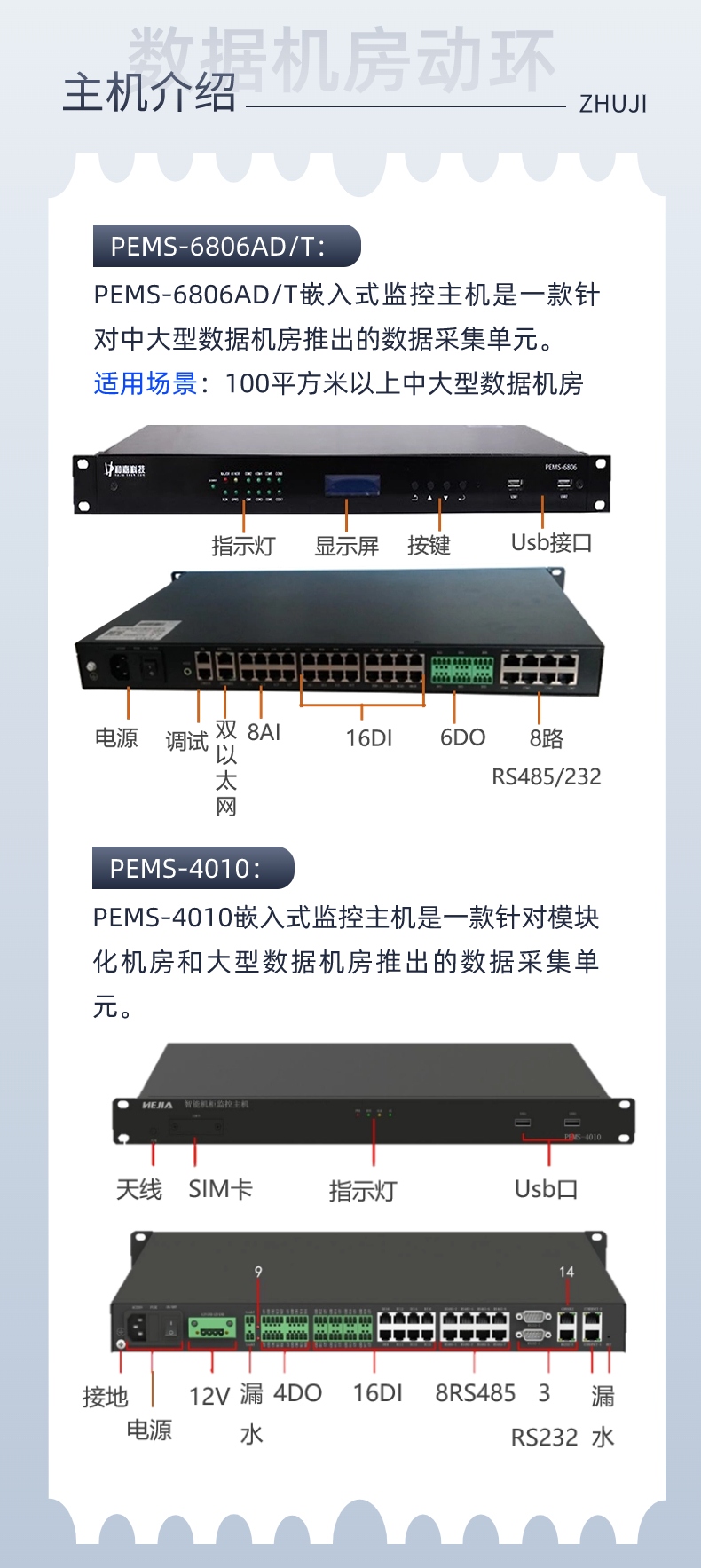 1、適用于30-50平方米小型數據機房,可選擇PEMS-3006嵌入式監控主機是一款針對小型數據機房推出的數據采集單元。
