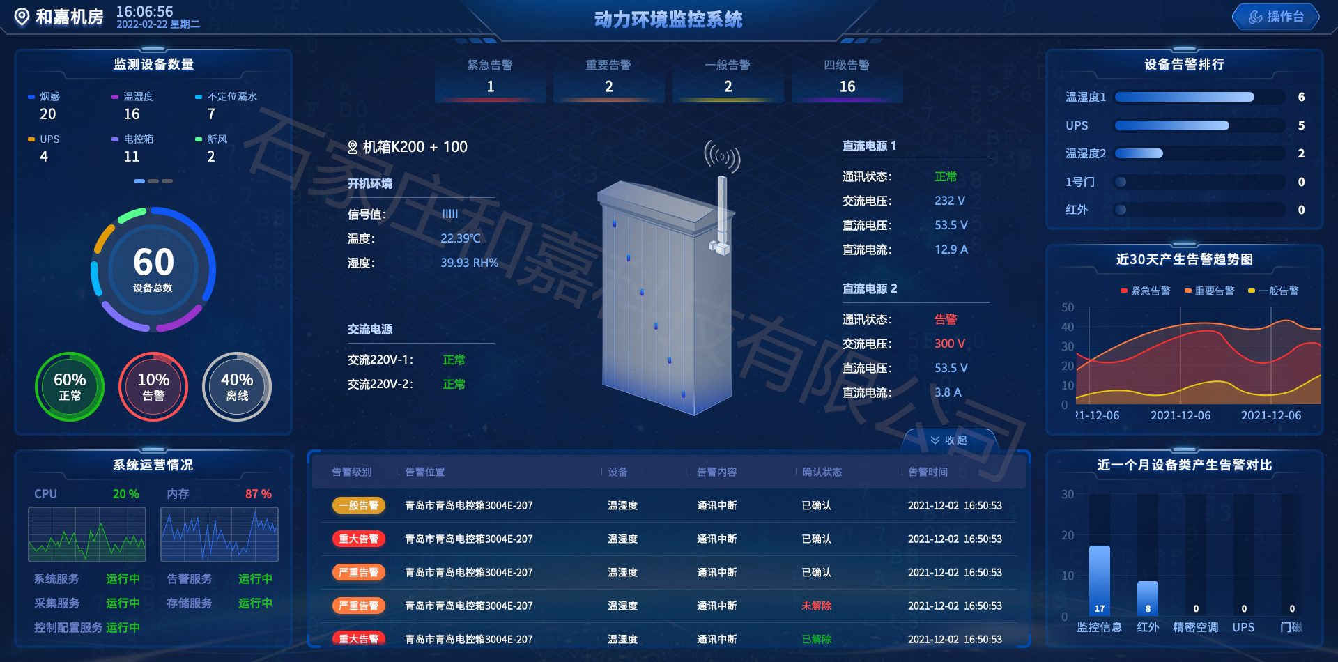 4G無線智能運(yùn)維及配套斷電監(jiān)測集中管理平臺軟件,通過管理平臺可實(shí)時(shí)展示每個(gè)4G無線智能運(yùn)維終端的信號強(qiáng)度、溫濕度信息、電壓、電流、通訊狀態(tài)、箱門開關(guān)狀態(tài),實(shí)現(xiàn)市電狀態(tài)實(shí)時(shí)監(jiān)測及斷電告警功能,并可通過短信、電話、語音多種報(bào)警方式通知運(yùn)維管理人員。