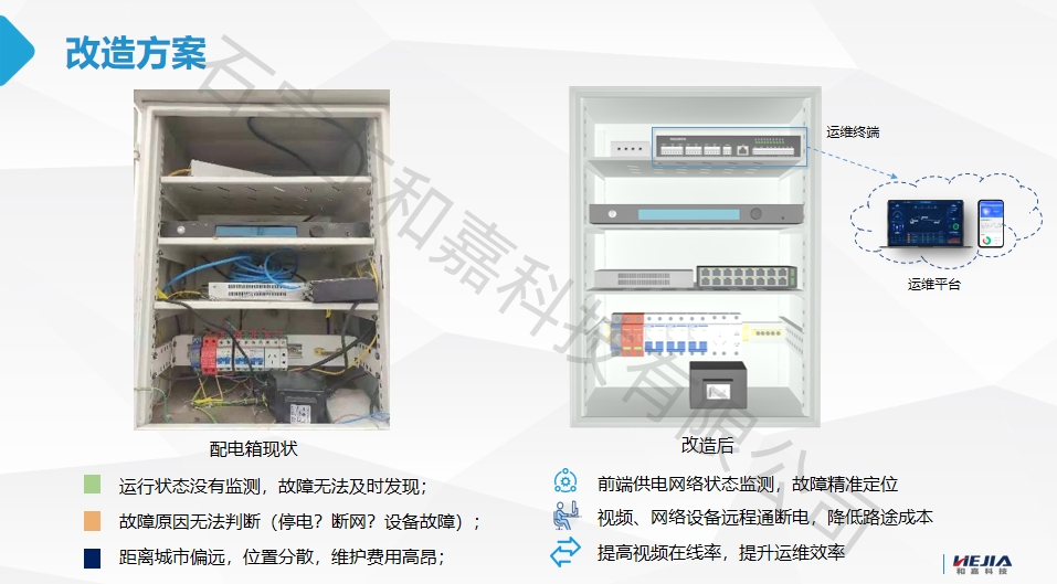改造方案:通過在原普通配電箱內增加智能運維終端,實現斷電斷網監測、網絡質量監測、光纖收發功率告警狀態監測及平臺集中運維,實現遠程監控與運維效率提升