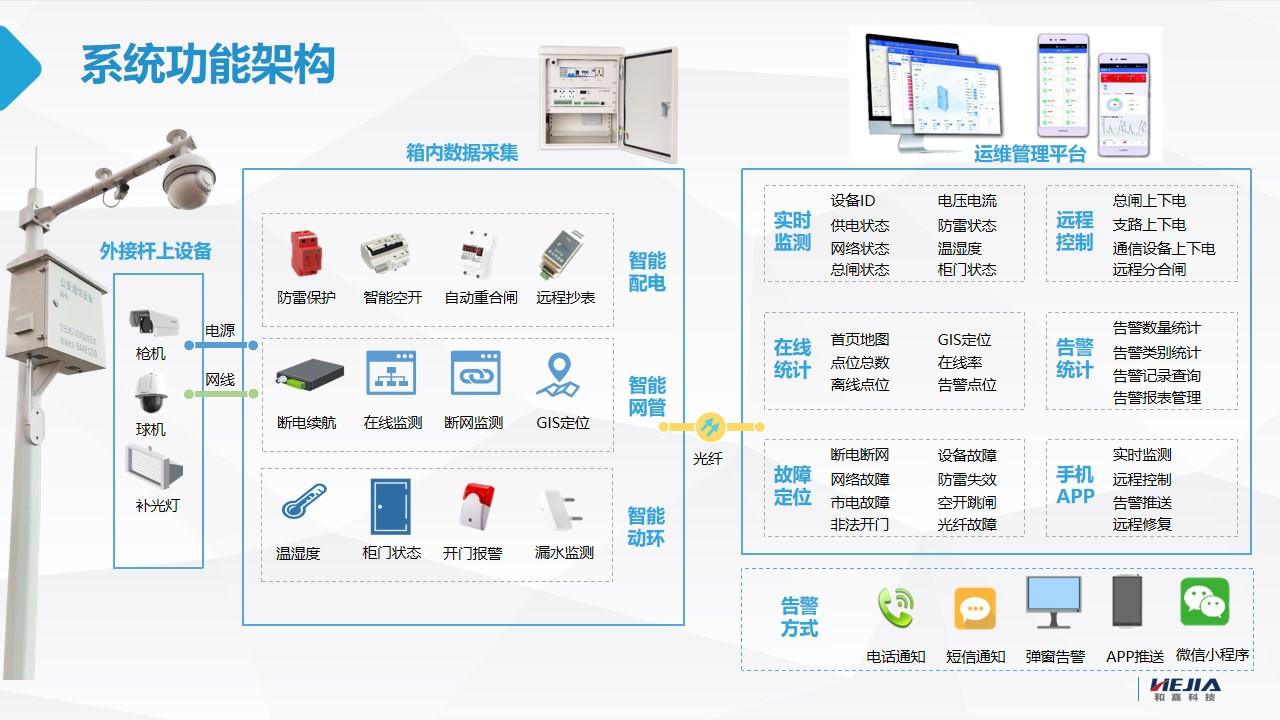 針對存在的以上問題,開發了智能運維終端及運維平臺產品,通過對智慧交通視頻監控設備配電箱智能化升級,實現對攝像機設備的供電和網絡狀態監測、光纖收發強度告警狀態監測、攝像機遠程通斷電控制;設備斷電斷網報警;箱內環境監測;通過少量的改造投入實現路段智能化管理,實現故障迅速定位,降低運維成本,提高在線率。
