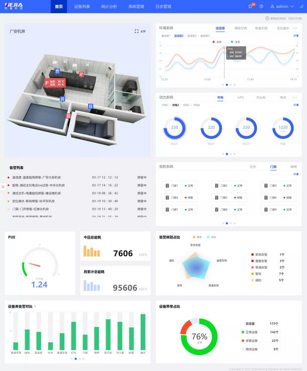遠(yuǎn)程監(jiān)控終端:監(jiān)控終端在聯(lián)網(wǎng)用戶的任意一臺電腦/平板上通過瀏覽器直接訪問,便于管理人員隨時隨地了解機房的工作狀況,實現(xiàn)對機房的集中監(jiān)控。在具有相應(yīng)權(quán)限下還可對設(shè)備實現(xiàn)遠(yuǎn)程控制,如空調(diào)的開關(guān)機、新風(fēng)機的開關(guān)機、遠(yuǎn)程開門等。
