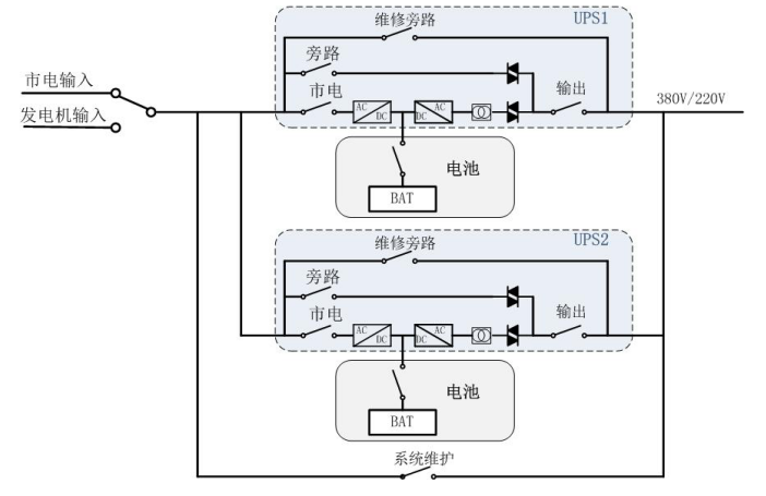 采用雙UPS,一臺為主供電電源,另一臺作為備份;當一臺發生故障時,另外一臺零延時接入,保障系統供電不間斷。