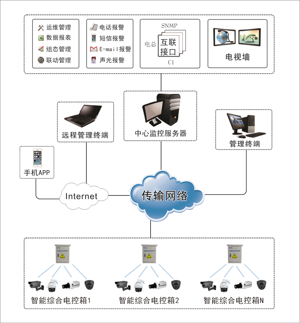 室外綜合電控柜運(yùn)維管理系統(tǒng)是基于TCP/IP網(wǎng)絡(luò)、RS232/RS485總線等技術(shù)的實(shí)時(shí)監(jiān)控與組態(tài)開發(fā)系統(tǒng)。系統(tǒng)采用B/S模式的模塊化結(jié)構(gòu),軟硬件的安裝與維護(hù)集中于監(jiān)控服務(wù)器端,易于實(shí)施和維護(hù)。客戶端只負(fù)責(zé)用戶界面顯示,數(shù)據(jù)處理放在嵌入式監(jiān)控主機(jī),當(dāng)監(jiān)控需求增加時(shí),只需對(duì)嵌入式監(jiān)控主機(jī)進(jìn)行升級(jí)或擴(kuò)展成多個(gè)嵌入式監(jiān)控主機(jī)即可,加強(qiáng)了系統(tǒng)的伸縮性。系統(tǒng)采用分布式計(jì)算技術(shù),支持多個(gè)前端室外綜合電控柜聯(lián)網(wǎng)集中監(jiān)控,系統(tǒng)主要由四部分組成:機(jī)房監(jiān)控中心、傳輸網(wǎng)絡(luò)、室外綜合電控柜和現(xiàn)場(chǎng)監(jiān)控設(shè)備。