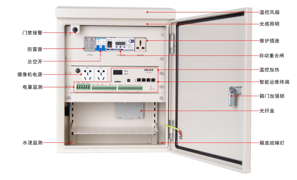 智能監控箱是一款應用于智慧交通、平安城市、雪亮工程、智慧社區、水利、能源、環保等領域的戶外智能機箱,相比普通配電箱,智能監控箱箱增加了智能配電、在線監控、故障定位、故障修復、遠程控制、能耗管理等功能,可以為外接設備如攝像機、補光燈、情報板等設備的安全、可靠運行提供保障,配合使用我公司開發的智能運維管理平臺可以顯著提高運維效率,降低運維工作量,在提高這些機電設備的在線率、完好率的同時可以為用戶創造可觀的經濟效益、社會效益。